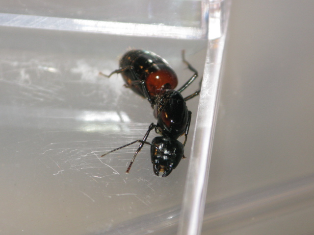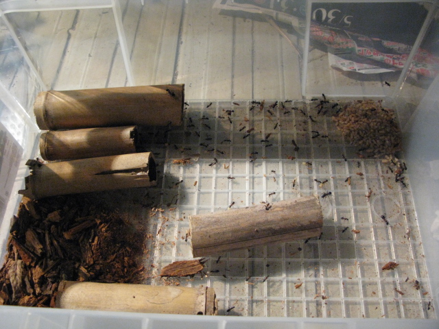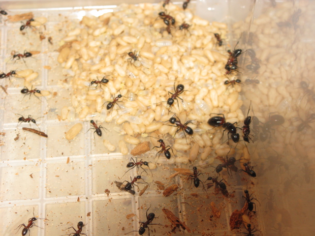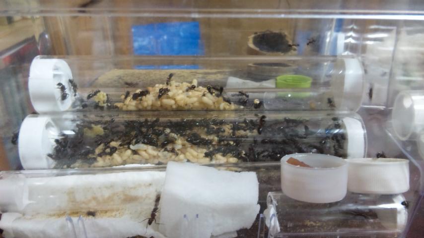 いつもの餌のほうが、「メープルシロップ+水+ローヤルゼリー(2000mm換算)+アントサプリ」食いつきがカナリ良い。 うちの隣に空き地があり、捨てられたじゅうたんがある。 そこをめくると羽蟻が多数いる。なんという種類だろうか。 近々採取して同定してみようかと思う。 裸蛹を3つ取って コロニーにあたえたが、どれも食べていた・・・。 アメイロケアリ アズマオオズアリ などは、飼ってみたいところである。 本日ムネアカオオアリコロニーをアクリルパイプに移し替えた。 かなり時間がかかり大変だった。 もう少ししたら、餌場はチューブでつないで別の容器にしようと思う。 一番気になっていた触角が片方の女王は、いまのところ健在である。 また、着々と別のムネアカオオアリ女王にニオイ付けを進行している。 ムネアカオオアリコロニーの数が違ってたため書換。 21年6月9日現在飼育中の蟻 クロオオアリコロニー 女王1働きアリ6他30 クロオオアリA 女王1卵幼虫10 ムネアカオオアリA 女王1卵幼虫14 ムネアカオオアリB 女王1卵幼虫9 ムネアカオオアリコロニー 女王1 兵隊アリ15 働きアリ250 卵他350 クロヤマアリ 女王1卵5 ミカドオオアリ 女王1 卵0 ミカドオオアリコロニーA 女王0 働きアリ80 他(卵幼虫蛹)100 ミカドオオアリコロニーB 女王0 羽雌2 働きアリ120 他(卵幼虫蛹)160 シベリアカタアリコロニー 女王?働きアリ60他90 ウメマツオオアリコロニーA 女王? 働きアリ80他120 ウメマツオオアリコロニーB 女王?働きアリ120他180 クロオオアリ兵隊アリA 兵隊アリ5匹のみ クロオオアリ兵隊アリB 兵隊アリ2匹のみ