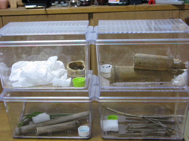わが家から、さほど遠くないところに山などがある。今日は、前日雨が降り続いていたのでムネアカオオアリポイントは、行かないで近場にした。 途中、堤防みたいなところに、亀やウシガエルorヒキガエルが居てびっくりした。第一の採取ポイント 竹やぶ葉っぱに、ヤマヨツボシアリ??らしきものがいた。胴体が赤い、体長5mmぐらい。我輩がほしかったのは、胴体も黒いヨツボシオオアリである。。。シンハンさんのサイトのBBSで同定してみようと思う。 ミカドオオアリコロニー??(約10mm~13mm)(約60匹)(直径70mm枯竹) イトウオオアリコロニー??(約4mm~7mm)(約70匹)(直径60mm枯竹) イトウオオアリっぽいコロニー??(約4mm~5mm)(約100匹)(直径20mm枯竹) まだ、女王アリを把握していない。 どのコロニーにも居てくれればいいのだが・・・。 まあ、竹を切るのに時間がかかったので後日に、しようと思った。 採取してるときだが直径が小さい竹はノコ、素手で切ったが、 直径60mm~70mmの竹(長さ2、5mmぐらい)をスクーターで持ってかえってきたのがめんどうだった。。 今回は、ナタの活躍があまりなかったが、コンクリートの上で使ったときに、少しカケタ・・・。 3400円もしたのに もっと慎重に扱うべきであった。 第二ポイントは、たいしていなかったが、スズメバチが居た。。あれをみると鳥肌が立つのは、なぜだろうか・・。 PR